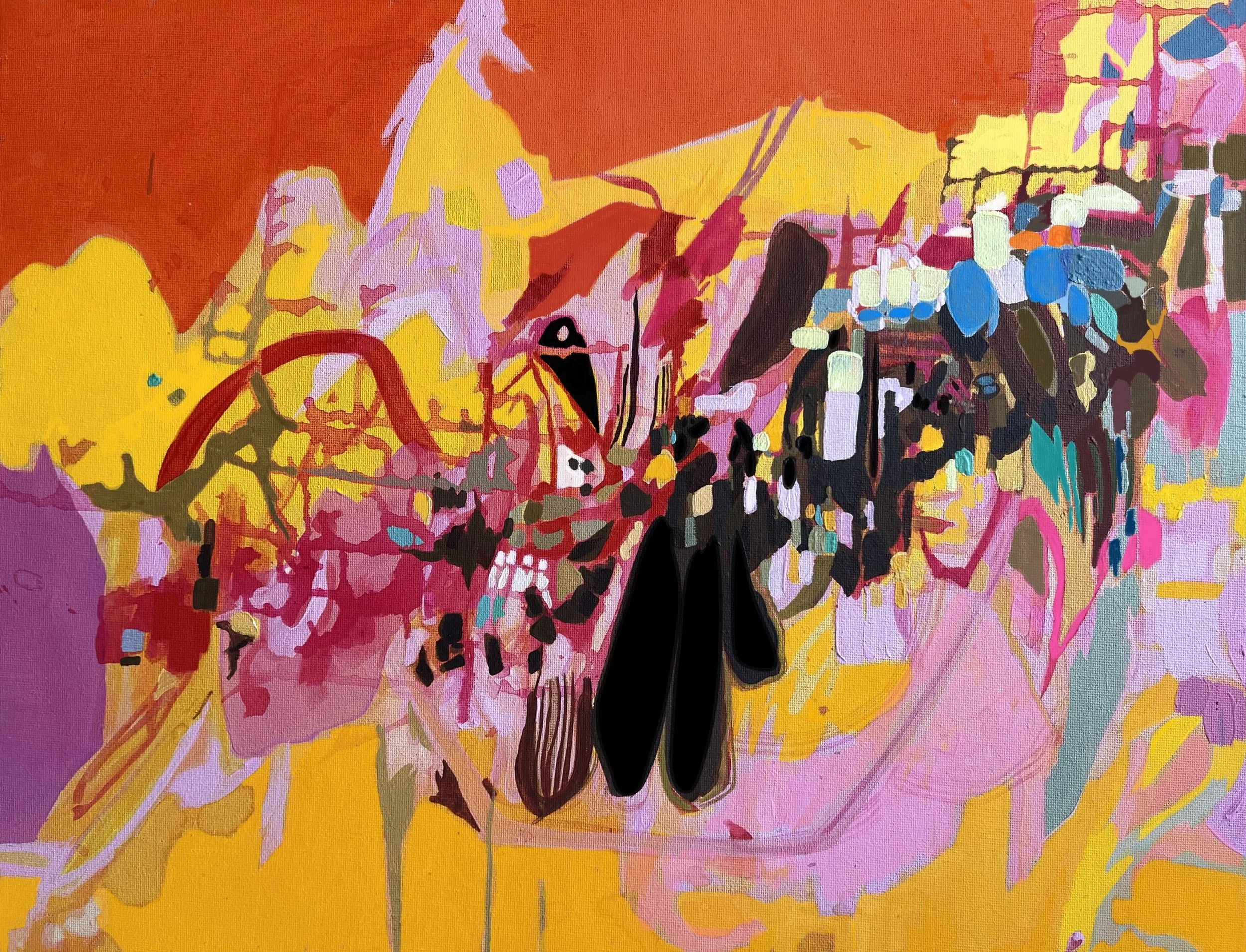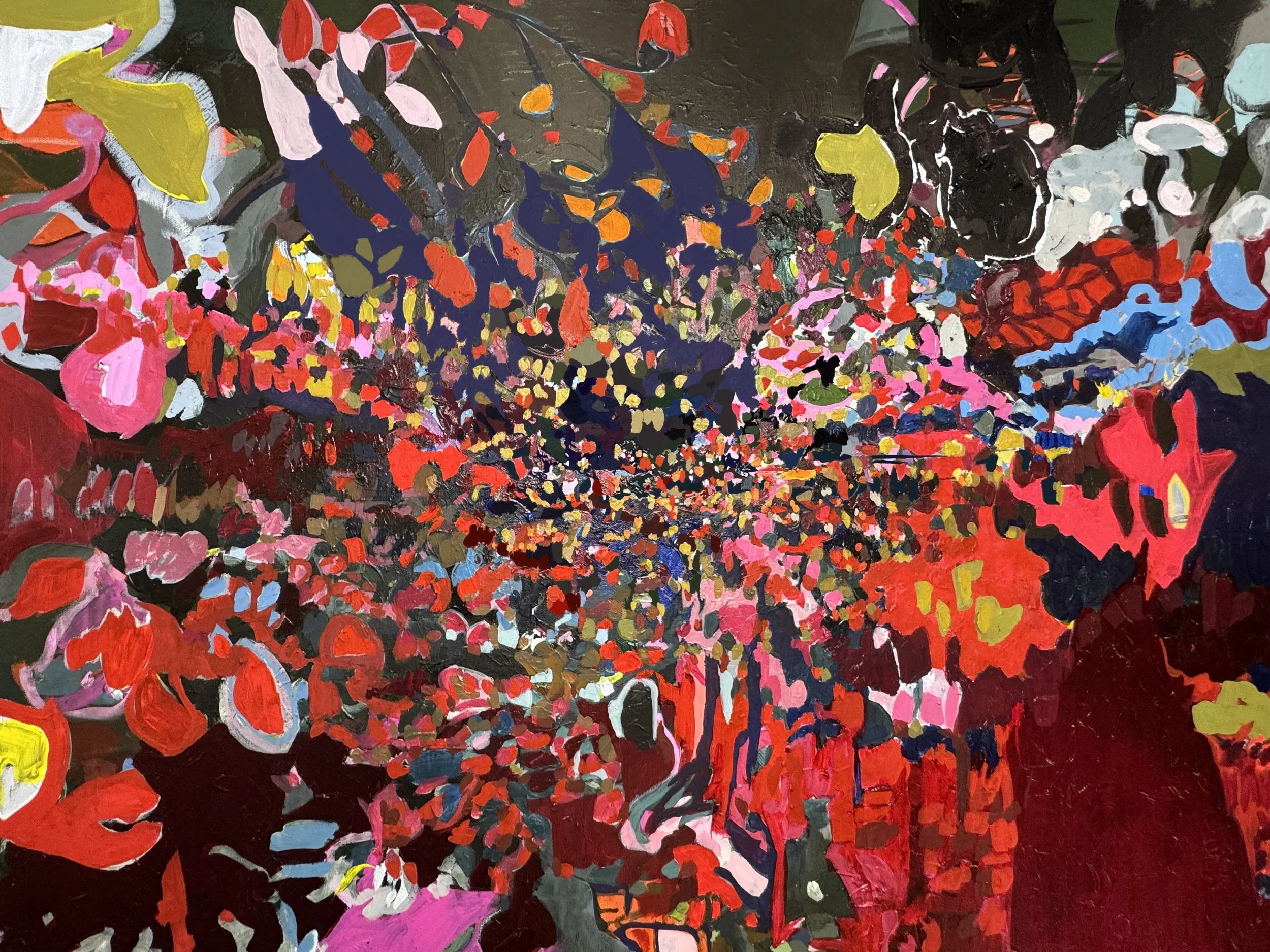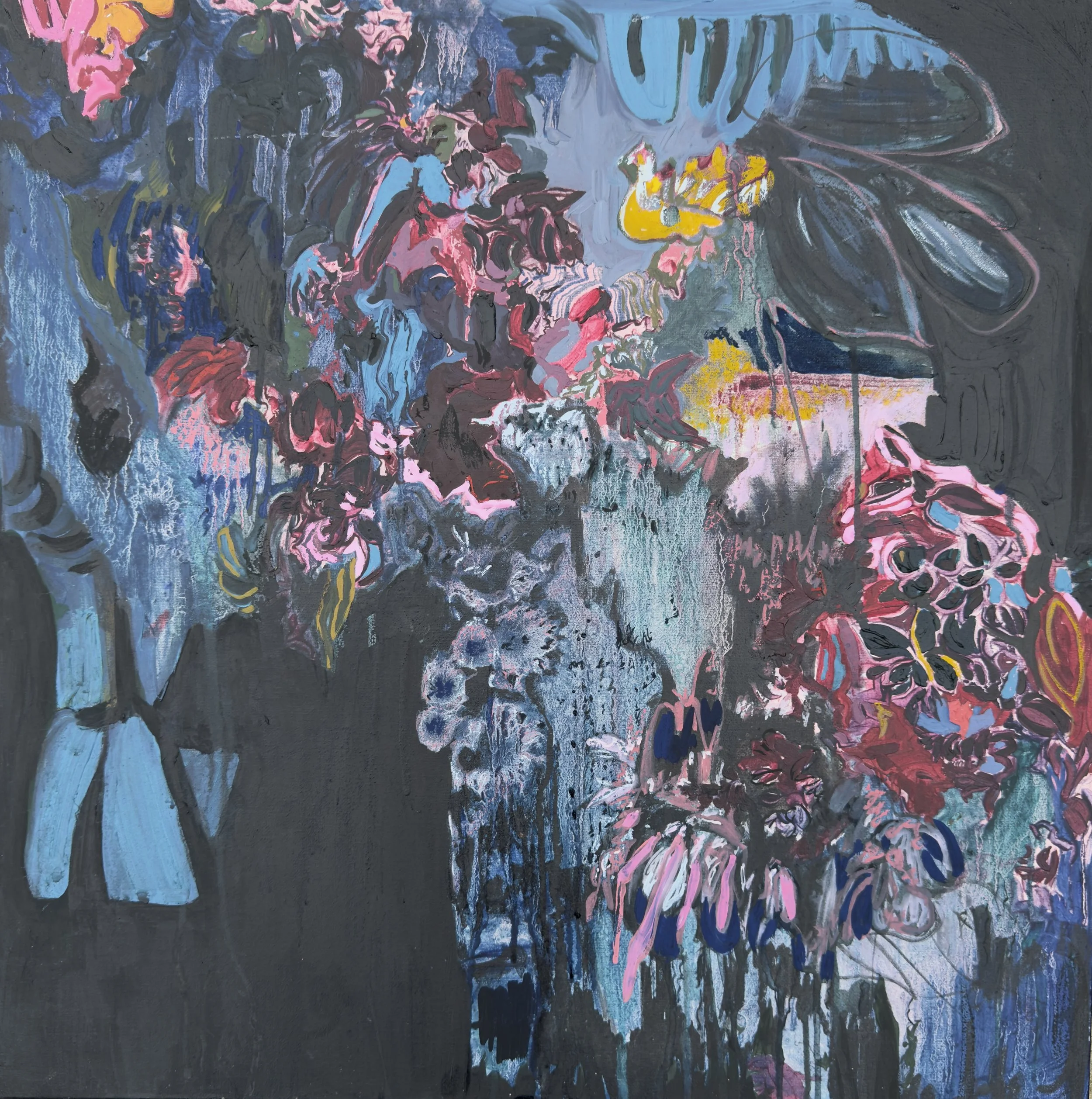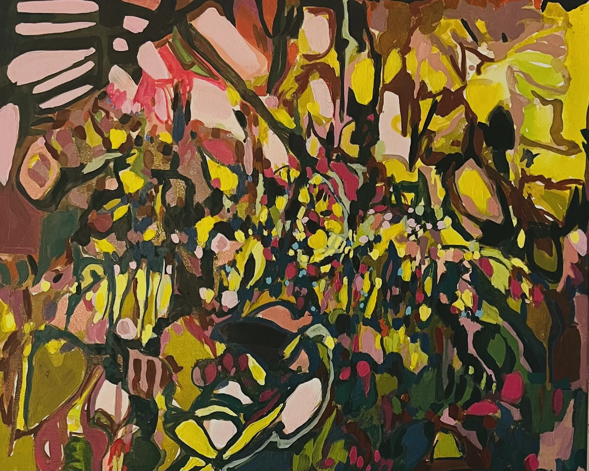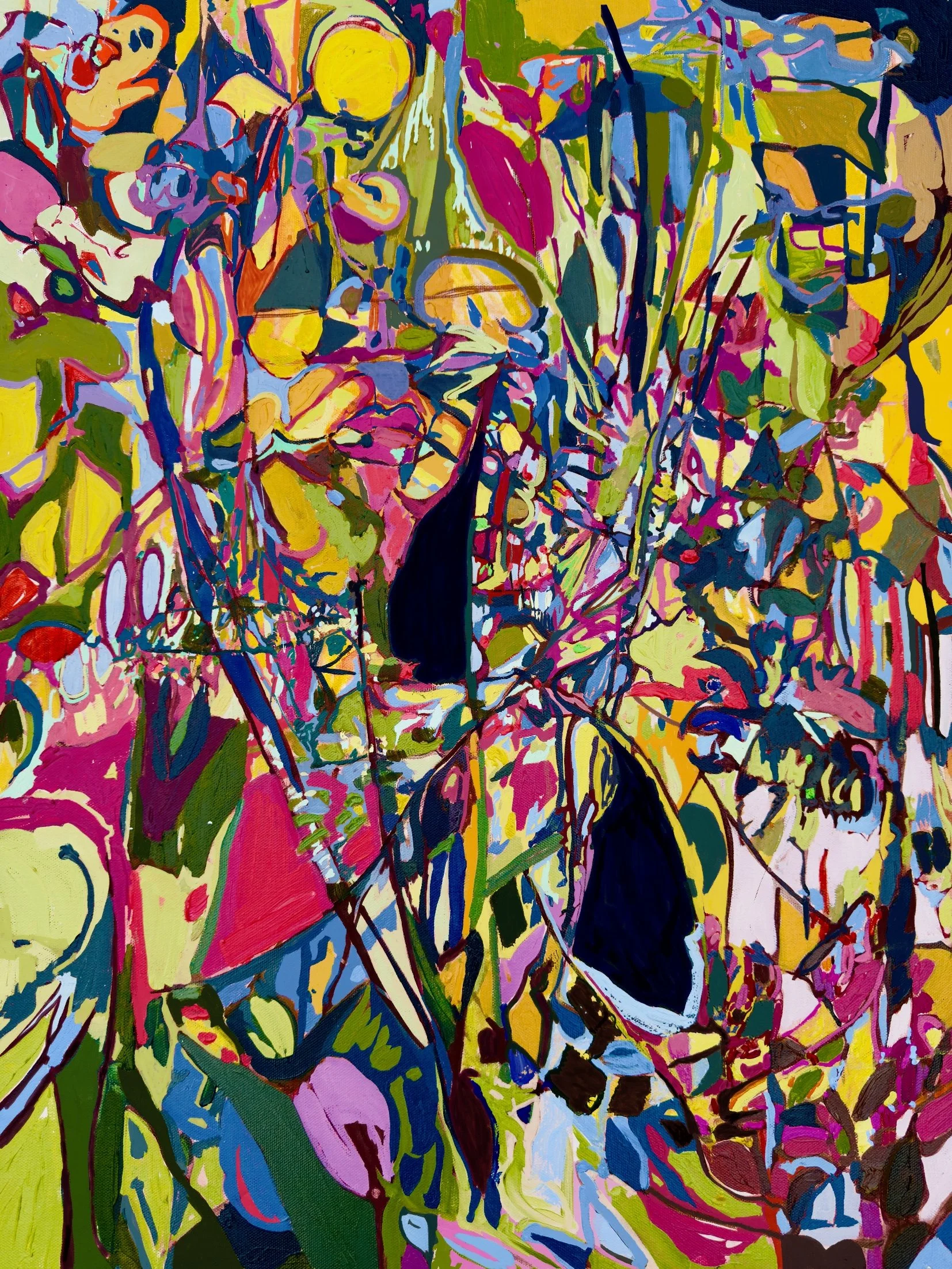 Following a layering regime of thick oil paint over a base layer of thinned acrylic paint, this painting was made while submerged in the woods and surrounded by trees. Bold , abstract shapes flirt with figuration. While organic forms, twist and bloom, creating a sense of momentum and flux.